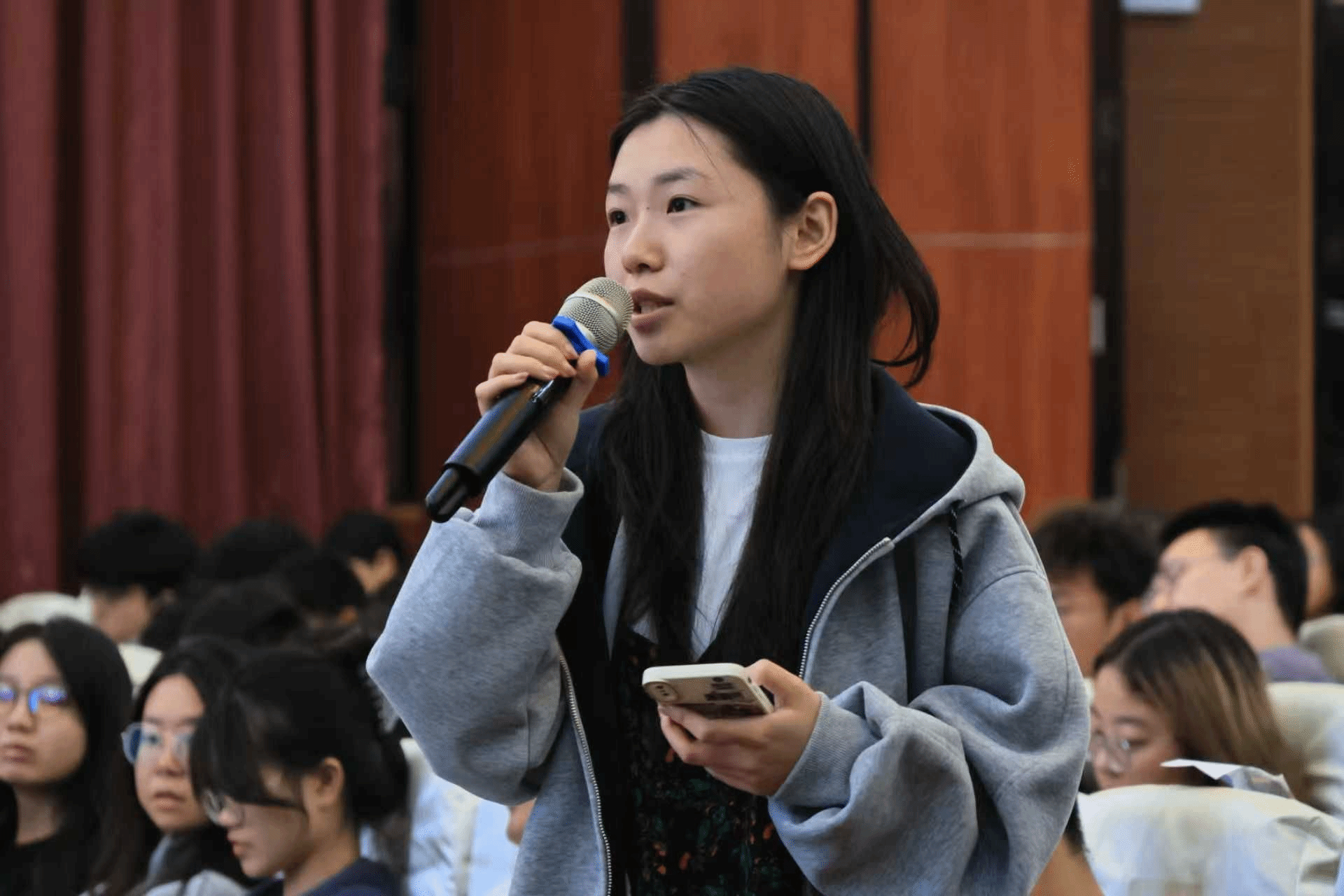 12月6日晚上,海南大学第十六期人文社科名家讲坛在社科楼二楼报告厅举办。学生代表提问。李思颖 摄