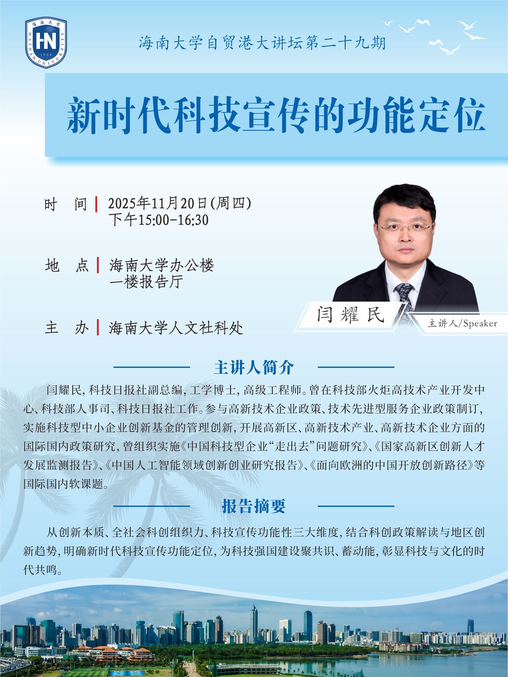 海南大学自贸港大讲坛第二十九讲预告:《新时代科技宣传的功能定位》